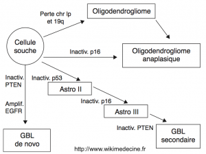 - Les gliomes de grade II dégénèrent inéluctablement en grade III puis en grade IV au fur et à mesure d'accumulations d'altérations génétiques qui seraient caractérisées par des mutations précoces de p53 et une boucle autocrine PDGF/ PDGFR. Des mutations ou délétions de p16 et CDKN2A sont retrouvées dans les foyers anaplasiques. La progression vers un glioblastome serait liée à la survenue de délétions du chromosome 10 et l'hyperméthylation de régions promotrices de RB1 et MGMT.